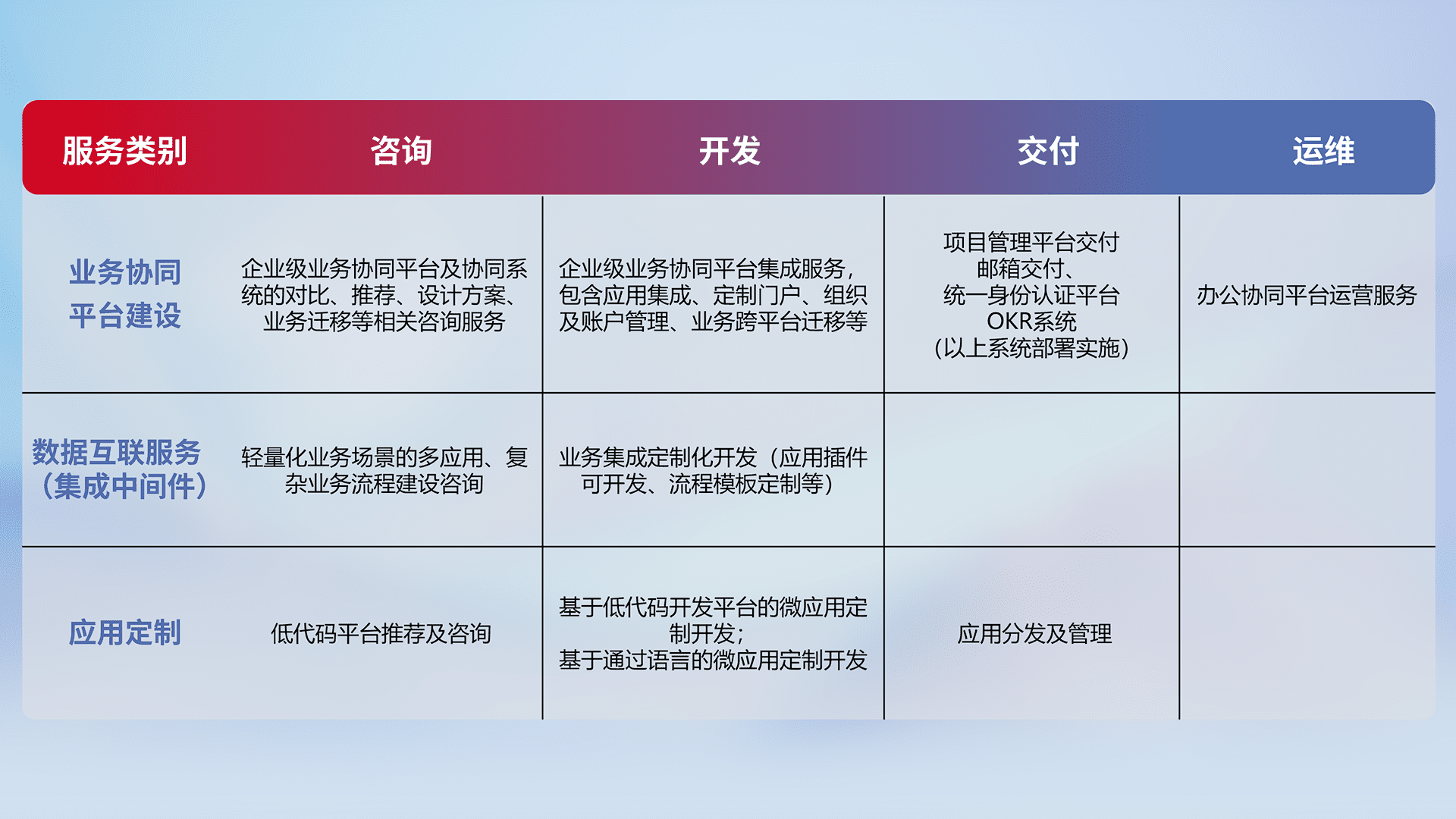 针对钉钉、、、企微、、、、IDaas等平台级产品提供产品的规划、、、方案、、、交付、、定制化开发等服务,,,实现如统一协同办公、、智能客户服务、、混合会议管理、、、、智能数据查询、、、、等业务场景,,实现数字化转型。。。